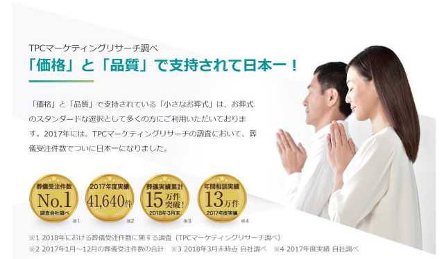 小さなお葬式の葬儀実績は2017年だけで41,640件でした。これは大手互助会や専門葬儀社よりも多い件数で、業界ナンバーワンの葬儀受注件数になっています。現在は家族葬規模のコンパクトで費用をかけない葬儀を希望する方が増えていることから、時代のニーズにマッチしたサービス内容を提供する小さなお葬式が注目されていることがわかりますね!