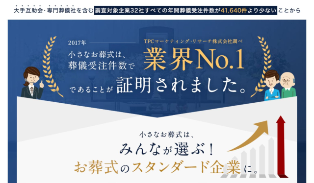 “text”: “小さなお葬式の葬儀実績は2017年だけで41,640件でした。これは大手互助会や専門葬儀社よりも多い件数で、業界ナンバーワンの葬儀受注件数になっています。現在は家族葬規模のコンパクトで費用をかけない葬儀を希望する方が増えていることから、時代のニーズにマッチしたサービス内容を提供する小さなお葬式が注目されていることがわかりますね!”