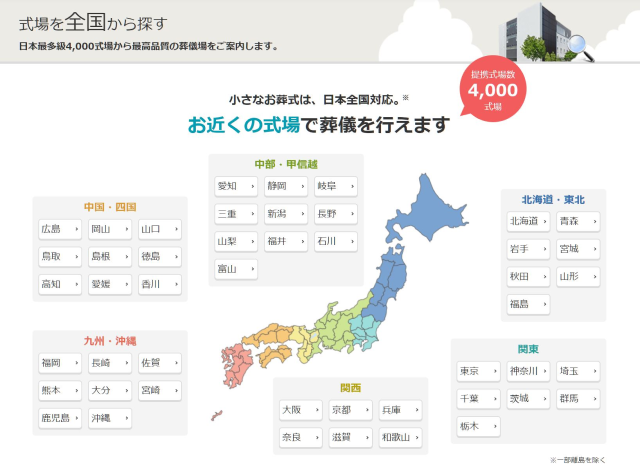 小さなお葬式は全国に4,000ヶ所以上の提携式場が存在しているので、最寄りの式場で葬儀を執り行えます。