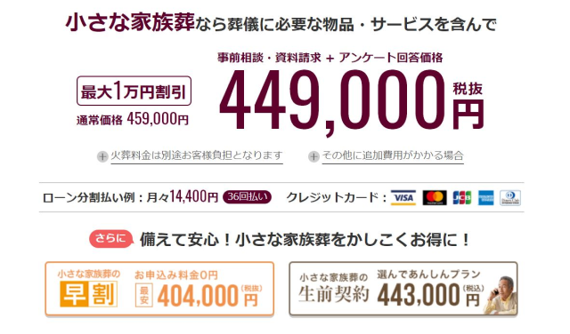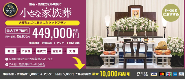 なお、エポスカード会員様は小さなお葬式の優待特典が用意されており、小さな家族葬の場合は優待料金が429,000円になります。