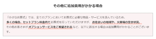 “text”: “小さな家族葬の定額料金でご利用いただけるサービス内容はこちらを参考にしてください。この他のオプションサービスを希望された場合や、火葬料金(地域によって違います)、お坊さんへのお布施などは追加費用がかかりますので、あらかじめご確認ください。”