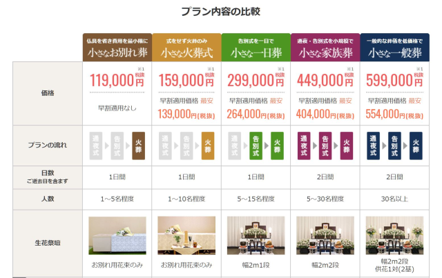 | 小さなお別れ葬 | 小さな火葬式 | 小さな一日葬 | 小さな家族葬 | 小さな一般葬 | |