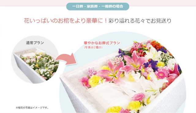 通常プランでもお棺の中にお花を添えますが、お花の量をさらに増やして華やかにお見送りできるプランになります。