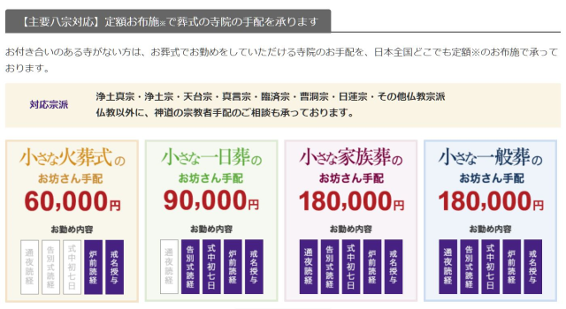 主要八宗派に対応しており、葬儀後に檀家になる必要もないので、葬儀の時だけお願いしたいと考えている方に便利なシステムです。